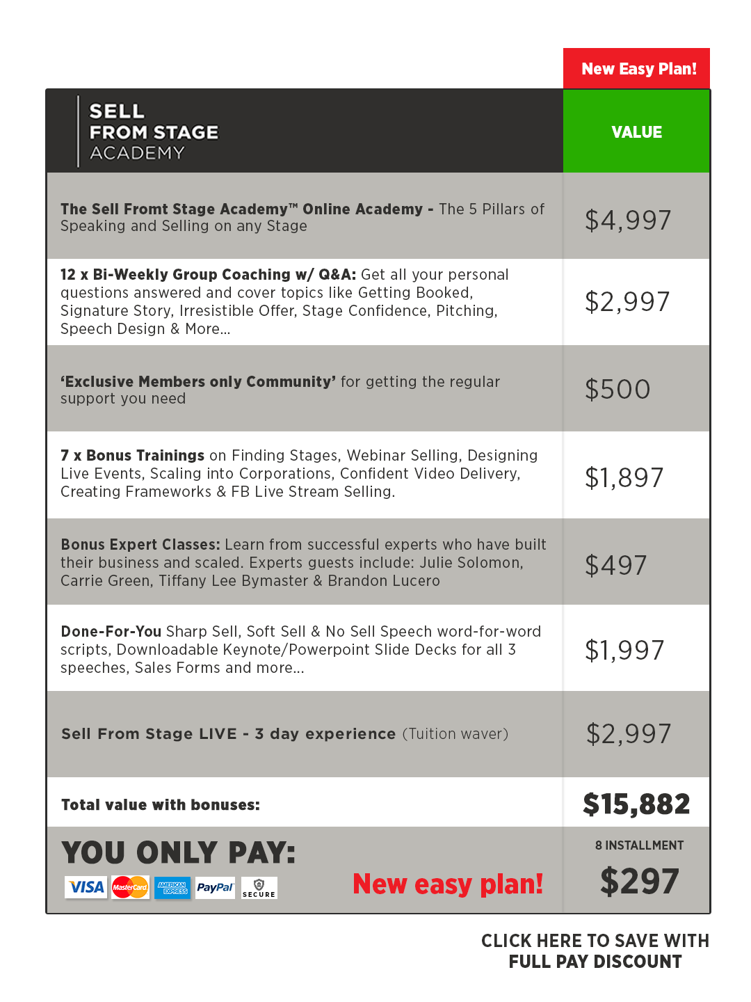 I can only speak from my own experience, and from what I’ve heard other successful entrepreneurs say. And that is ‘that spending money to learn how to make money is not a cost it’s an investment’. In fact, a lot of the students in the Sell From Stage Academy use the formula in their first presentation or webinar and make back their entire investment. Obviously, I can no way guarantee this as everyones personal situation is different. But I'd recommend not to think about this investment as a ‘sunk cost’. This is the seed that will grow into the oak tree of your business. Most presentations I do I’ll gross more than $10,000 - $40,000+ in revenue on the backend. If I saw ‘investing in myself’ as being something I couldn’t afford I would never be able to teach you this proven formula.