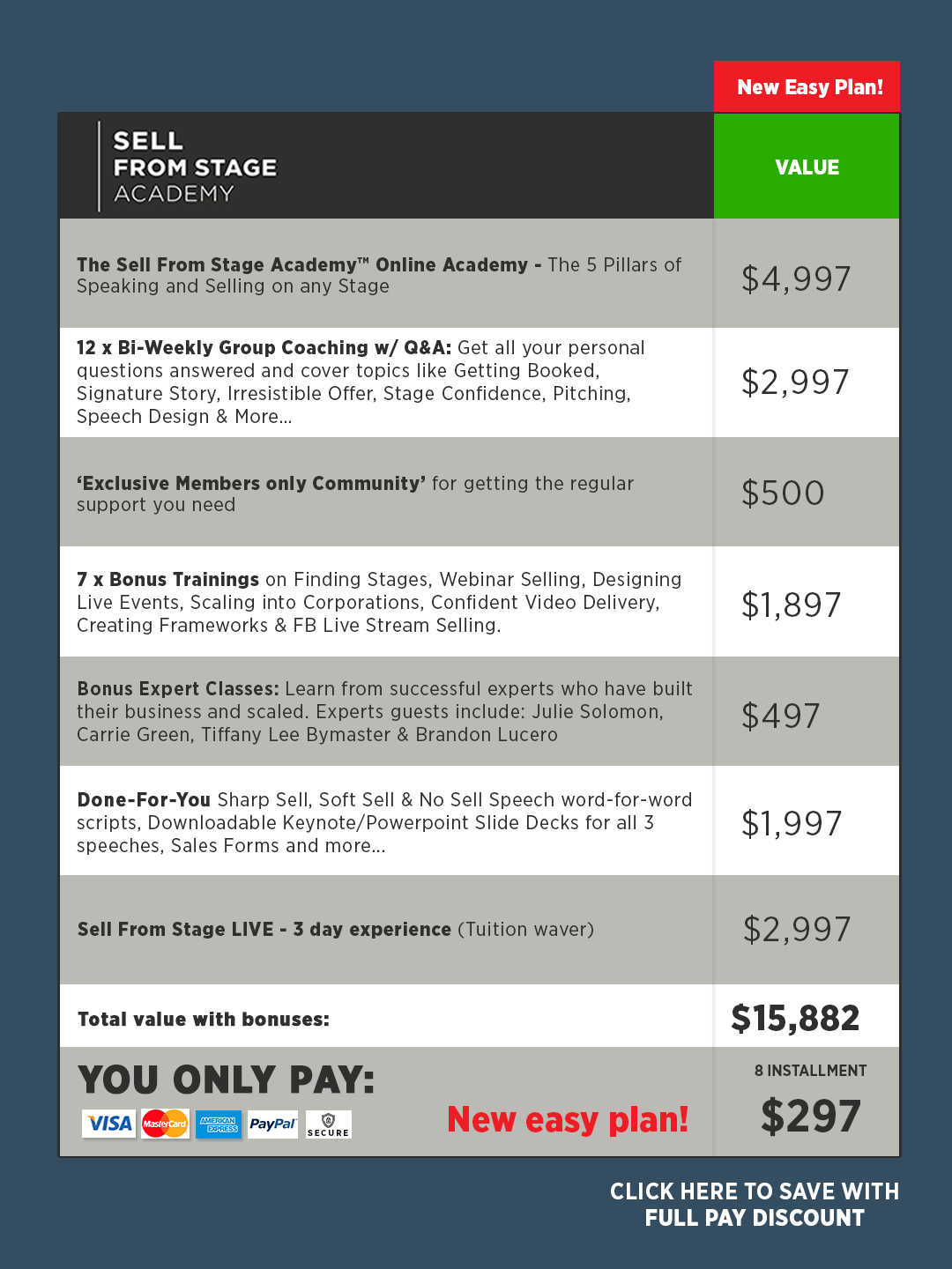 I’ve broken the Sell from Stage Academy (based around my unique infusion speaking method) into easy-to-follow, short video tutorials that cover five crucial phases. Each phase is designed to help you master a different element of selling from the stage — from crafting a powerful presentation to transitioning seamlessly into your pitch.