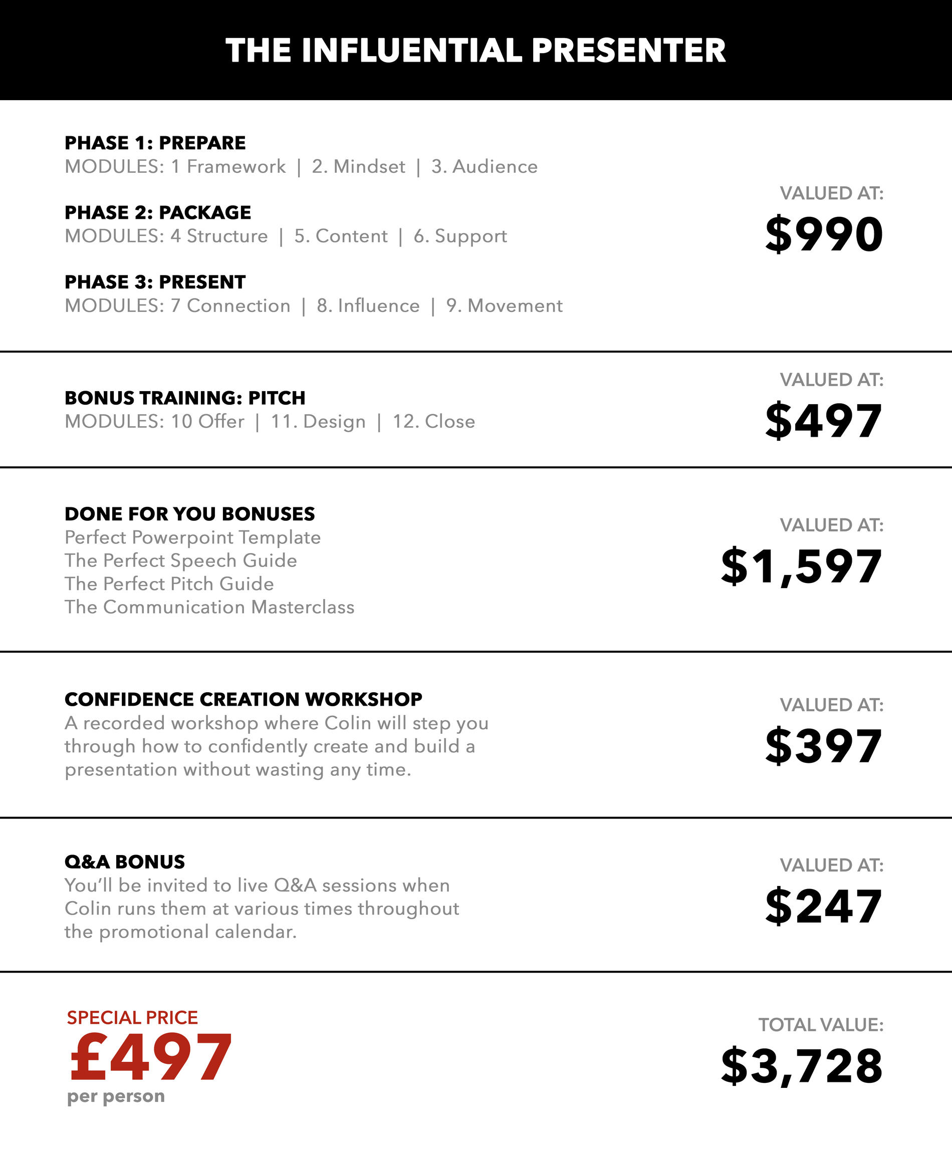 In the Influential Presenter Program, Colin takes the complex and sometimes daunting and makes it simple and actionable.