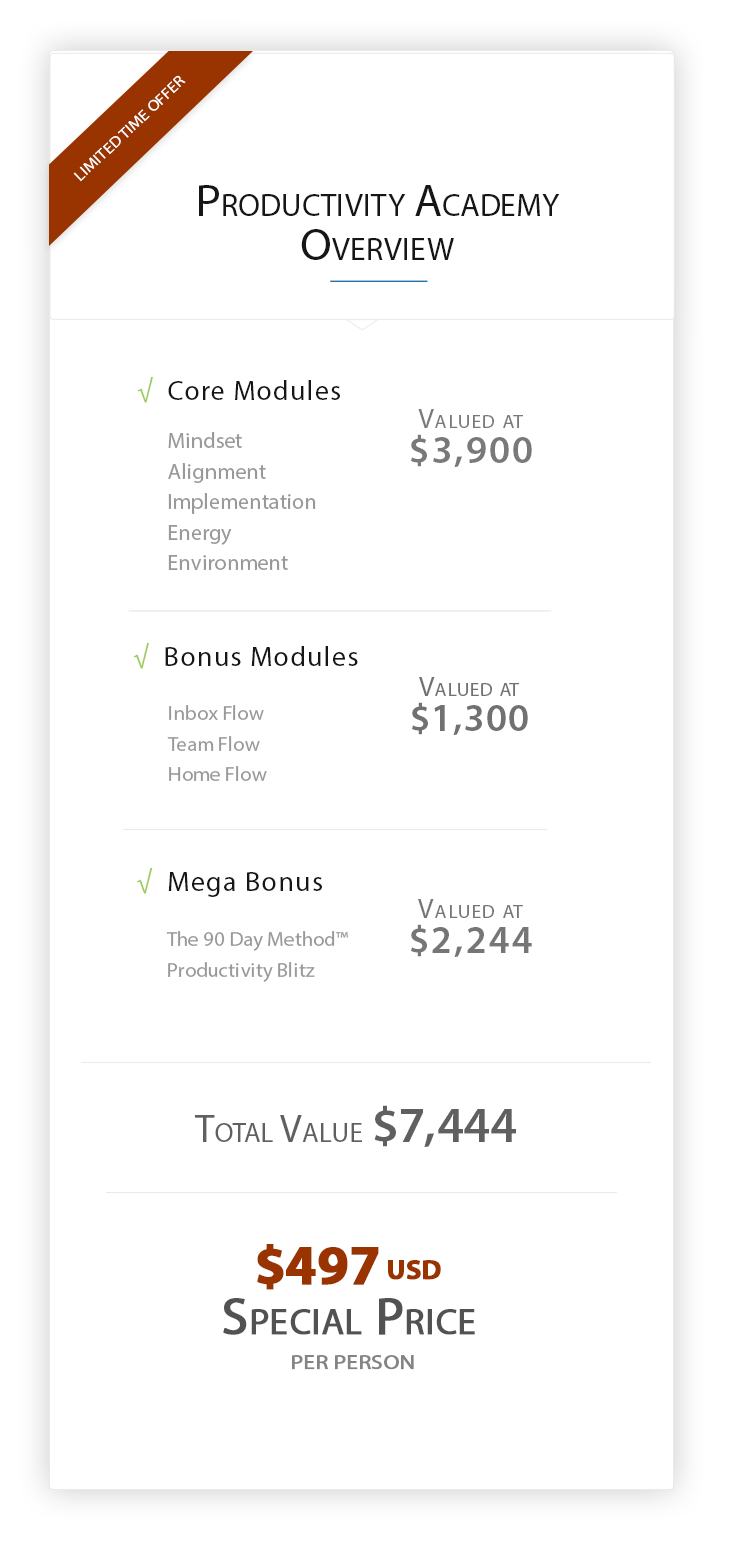 Your ability to gain access to the Productivity Academy will finish as soon as the timer ends. This page will then expire and you'll be locked out. So grab it as this special price while you still can. Can't wait to see you inside!