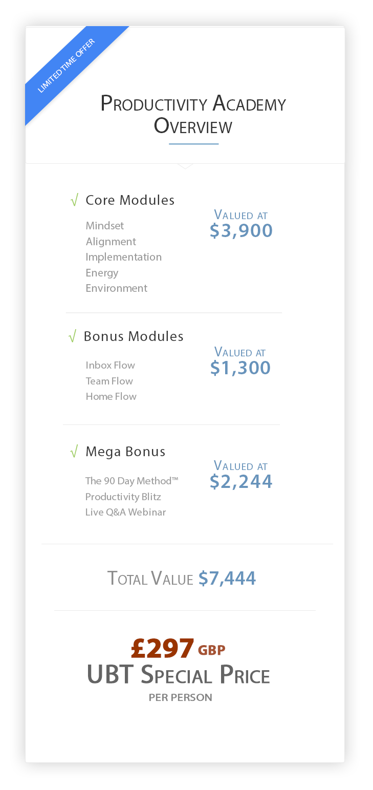 Colin will be running a live UBT Q&A Webinar where he will answer any questions you have about productivity or the Productivity Academy. You can submit your questions prior or he will answer them live. You'll be sent the schedule for this session in a couple of week. The recording will be sent to you if you aren't able to make the live session.