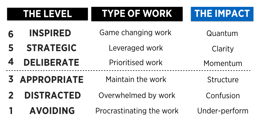 The Productivity Academy is designed you to take you from levels 1,2 and 3 into levels 4, 5 and 6. It will help you to move out of procrastination, overwhelm and distraction into deliberate strategic and inspired work.